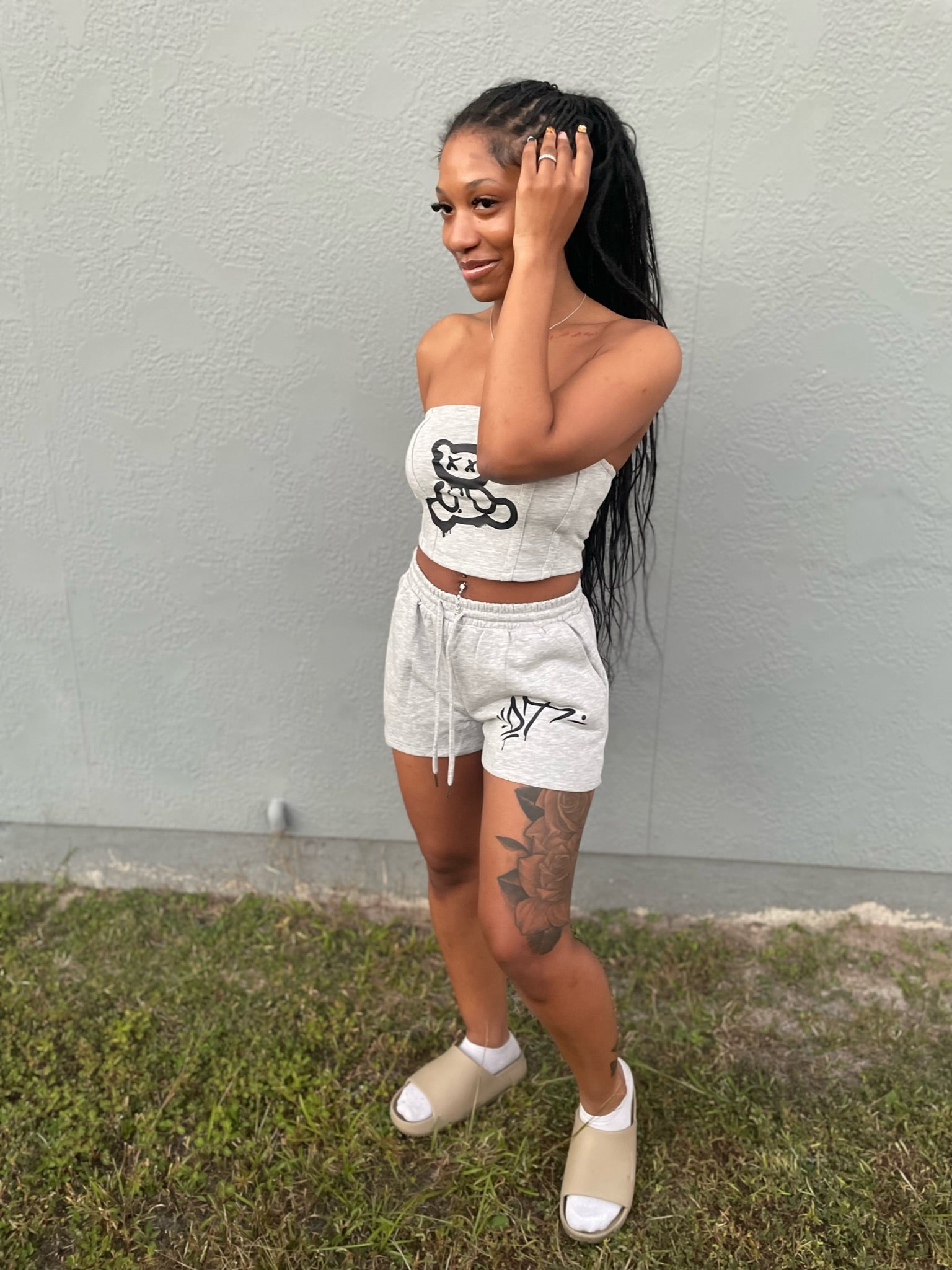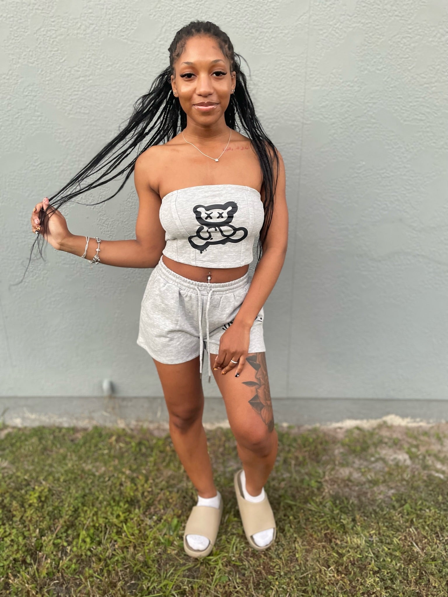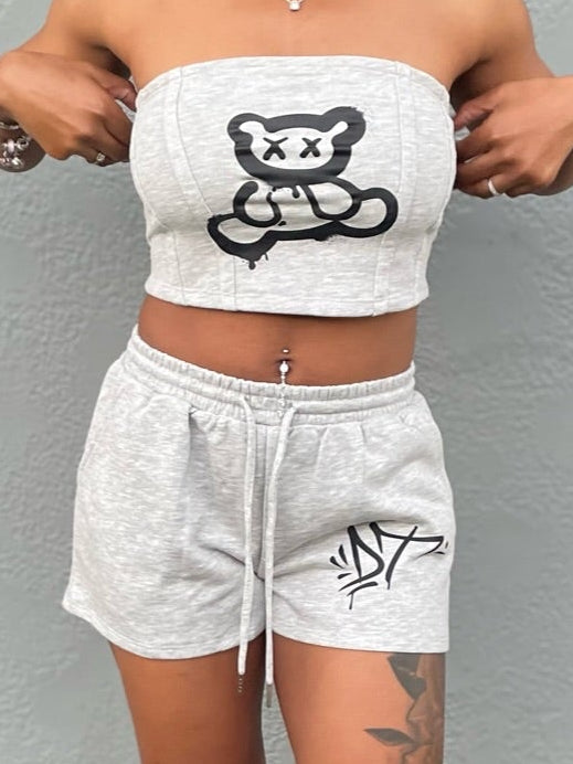 The bandeau top features our signature teddy graphic — soft, stretchy, and made to hug your shape with confidence. Paired with relaxed drawstring shorts, it’s the ultimate mix of chill and bold — perfect for lounging, flexing, or stepping out in your element.